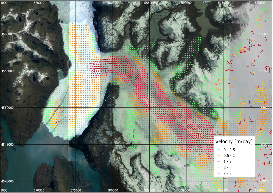 Glacier velocity estimated using Pixel Offset Tracking. Example over Campos de Hielo Sud (Chile)